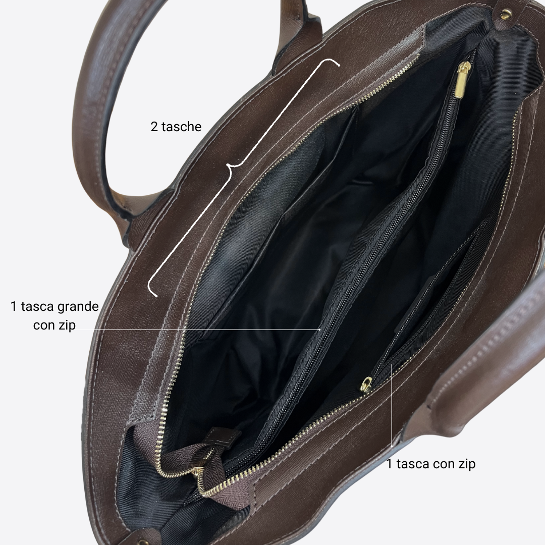 Interno: Foderato in tessuto, con due scomparti capienti, una grande tasca centrale con chiusura zip e pratiche taschine laterali. Super funzionale: entra anche il computer.